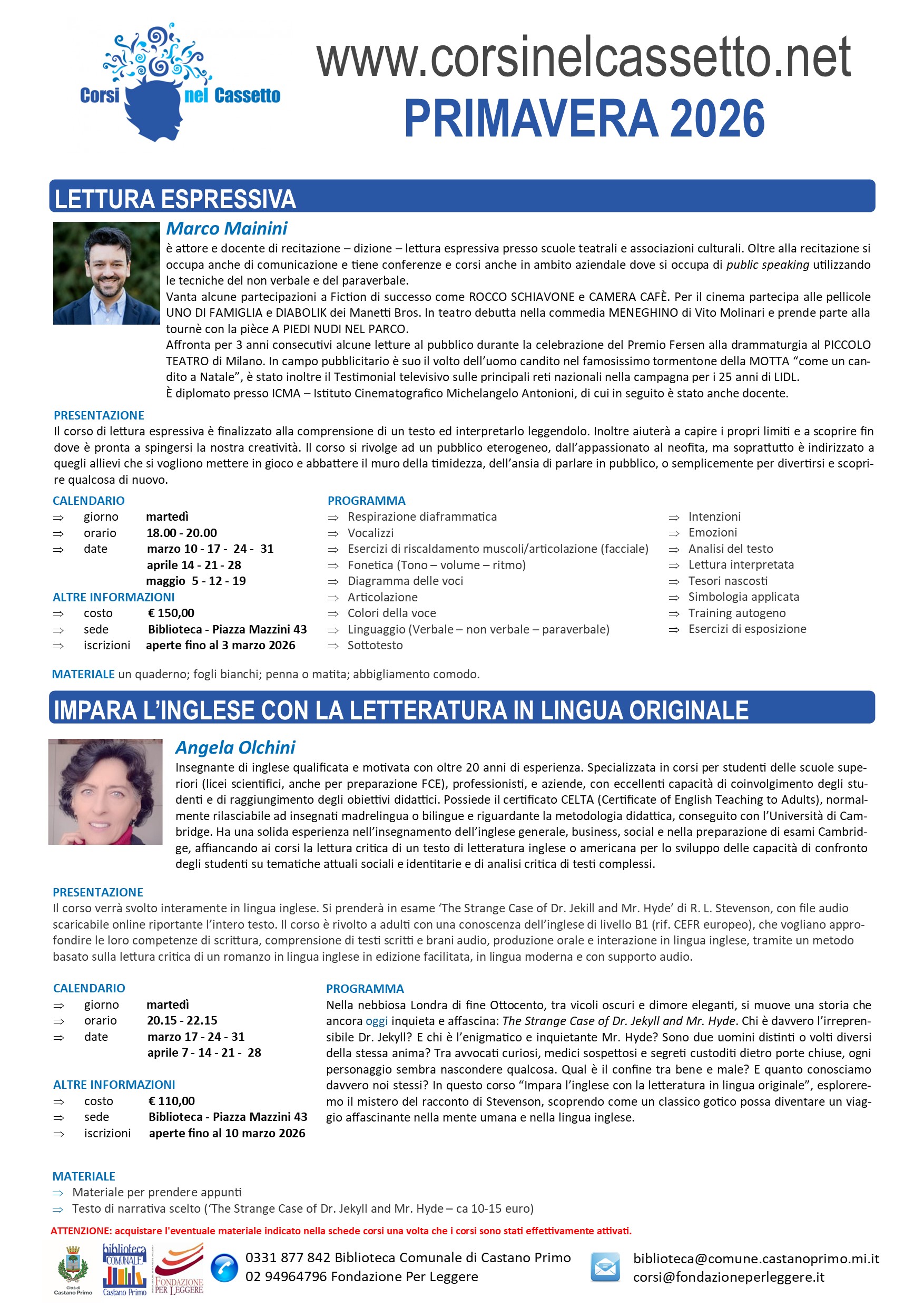 Sono aperte le iscrizioni ai Corsi nel Cassetto presso la Biblioteca Comunale di Castano Primo. In programma due percorsi: