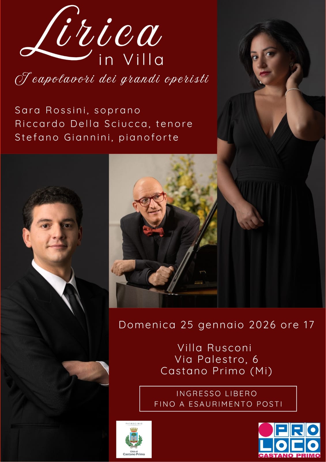 Domenica 25 gennaio 2026 alle ore 17, la pro Loco di Castano Primo propone l'appuntamento "Lirica in Villa" con Sara Rossini (soprano), Riccardo Della Sciucca (tenore) e Stefano Giannini (pianoforte).
