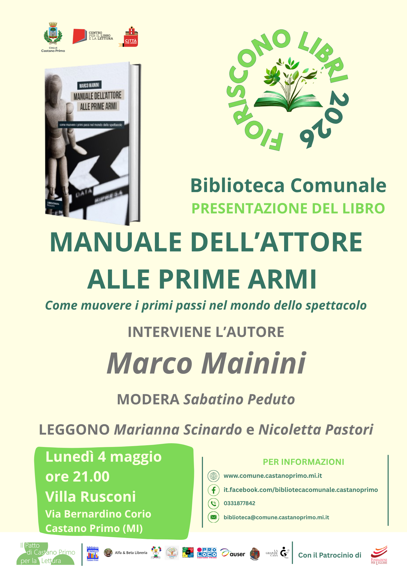 Lunedì 4 maggio, alle ore 21:00, in Villa Rusconi, si terrà la presentazione del volume "Manuale dell’attore alle prime armi. Come muovere i primi passi nel mondo dello spettacolo" di Marco Mainini.