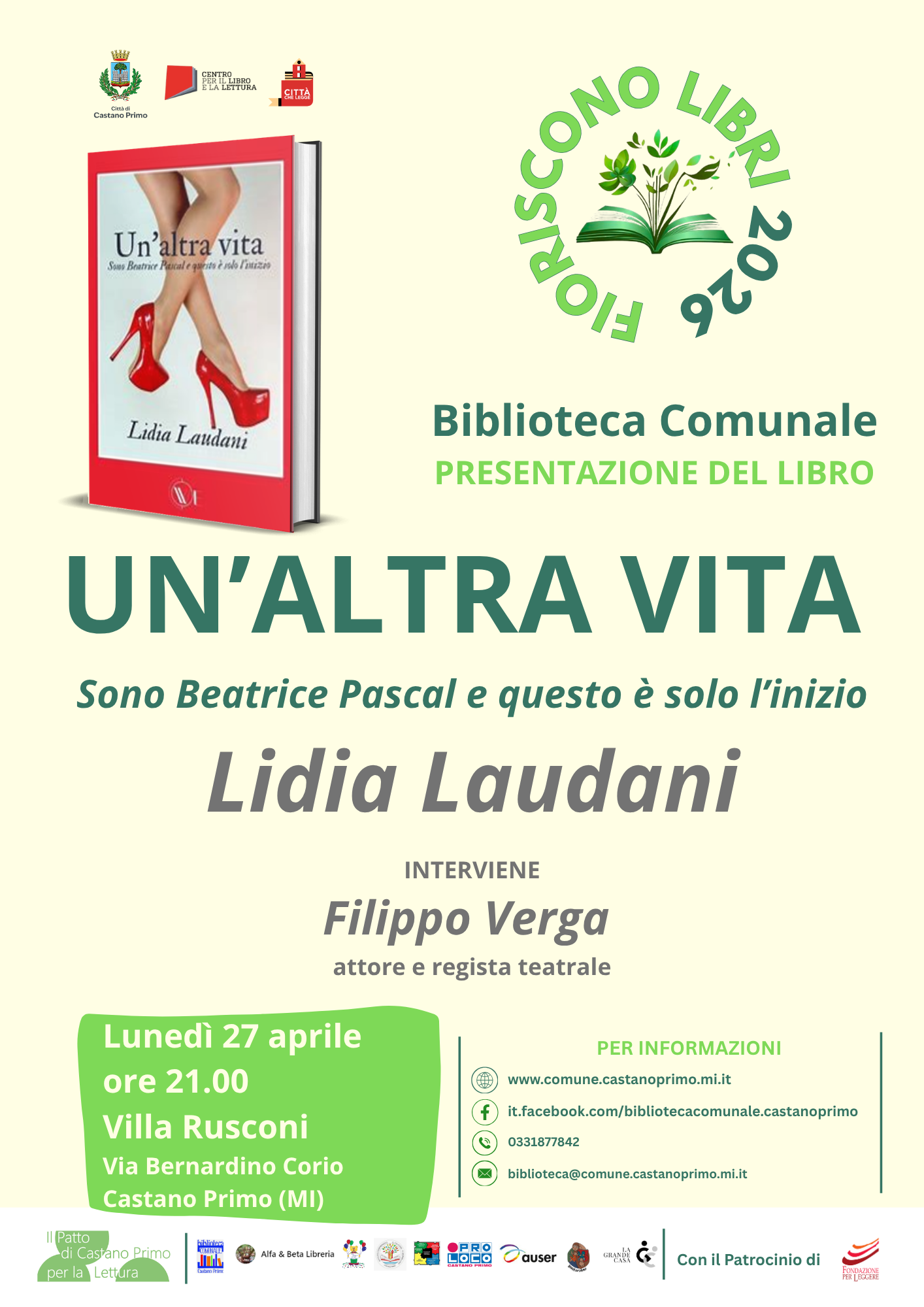 Nell'ambito della rassegna "Fioriscono Libri 2026", lunedì 27 aprile alle ore 21:00, in Villa Rusconi, si terrà la presentazione del libro "Un’altra vita: sono Beatrice Pascal e questo è solo l’inizio" di Lidia Laudani. L'incontro, che vedrà la partecipazione dell'attore e regista Filippo Verga, è dedicato alla sensibilizzazione su temi quali la violenza psicologica, il revenge porn e lo stalking, con un focus sulla prevenzione e la rinascita.