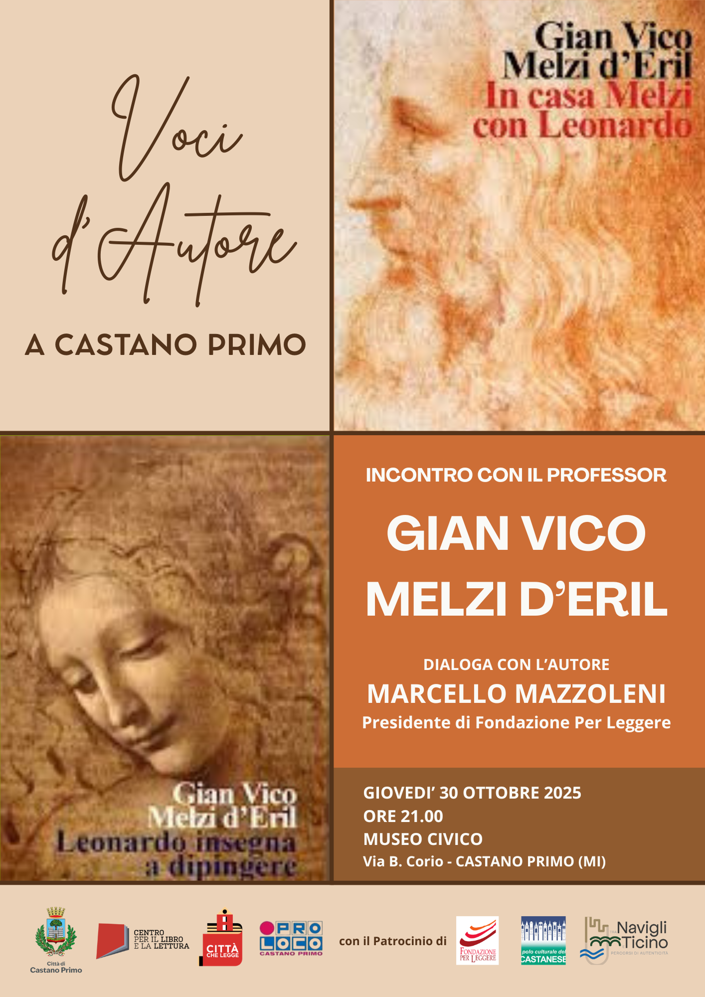 Autore dei volumi "In casa Melzi con Leonardo" e "Leonardo insegna a dipingere", Melzi D’Eril dialogherà con Marcello Mazzoleni, presidente di Fondazione Per Leggere, per accompagnare il pubblico in un viaggio tra arte, storia e memoria.